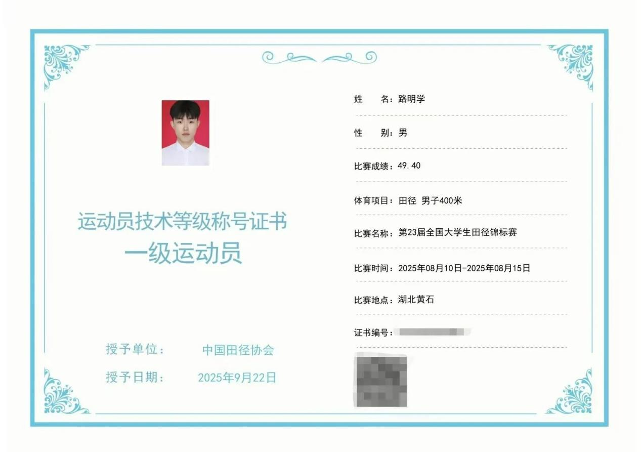 2025年第23届全国大学生田径锦标赛于湖北黄石圆满收官。此次赛事吸引了来自490所高校的5000多名运动员参与,赛场上竞争异常激烈。我校代表队在比赛中表现出色,荣获“全国优秀运动员”“优秀教练员”等荣誉,这让全校师生倍感振奋。 我院路明学同学在男子400m比赛中,以49.40秒的成绩达到国家一级运动员标准。如今,他已正式获得一级运动员证书,成为我校首位获此殊荣的学生。 让我们为路明学同学的出色表现点赞喝彩!...