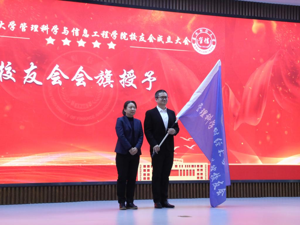 校党委副书记霍志刚向管理科学与信息工程学院校友会会长姜军授予校友会会牌,学院党委书记丛彪为理事会领导机构成员和理事颁发聘书,党委副书记韩永慧为校友会秘书长张志成授会旗。