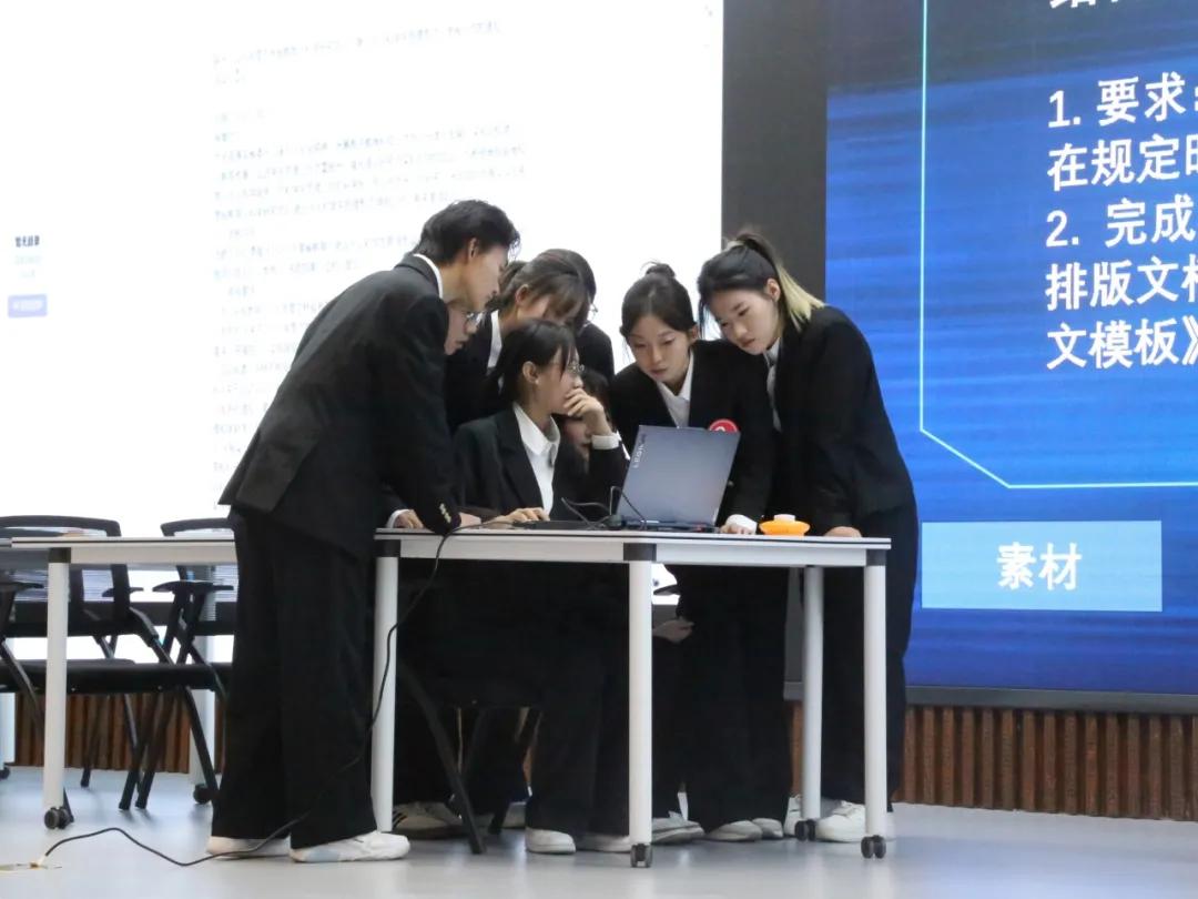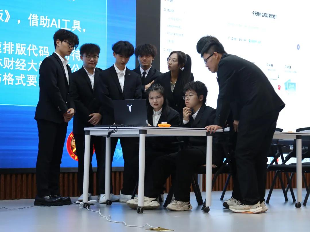 作为整场比赛的终极挑战,八支队伍通过抽签分成两组,每组共用一台电脑,借助WPS灵犀及Deepseek等AI辅助完成综合性任务,队员们分工协作、默契配合,评委老师结合任务完成质量、协作效率及AI运用能力进行专业点评,既肯定亮点,也指出优化方向,助力选手明晰提升路径,帮助同学们树立科学利用AI赋能自身学习与成长的理念。